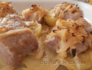 Toma nota: 1kg de lomo en un trozo ❥ 5 patatas medianas ❥ Romero o romero en polvo ❥ Sal ❥ Pimienta negra ❥ Aceite ❥ 1 cuña de queso ❥ 1 cabeza de ajos ❥ 2 cebollas grandes ❥ 1 vaso de vino blanco.